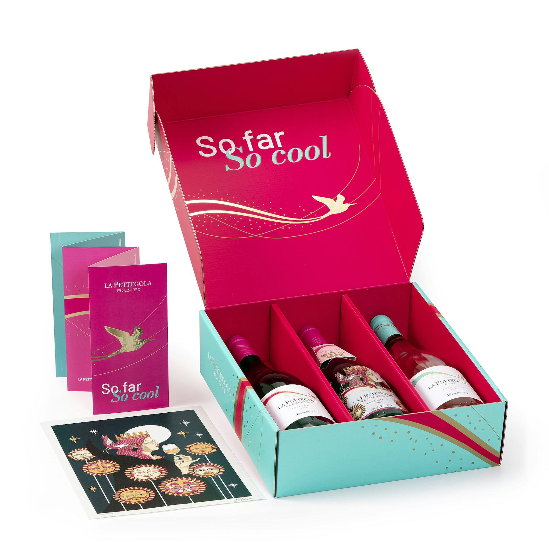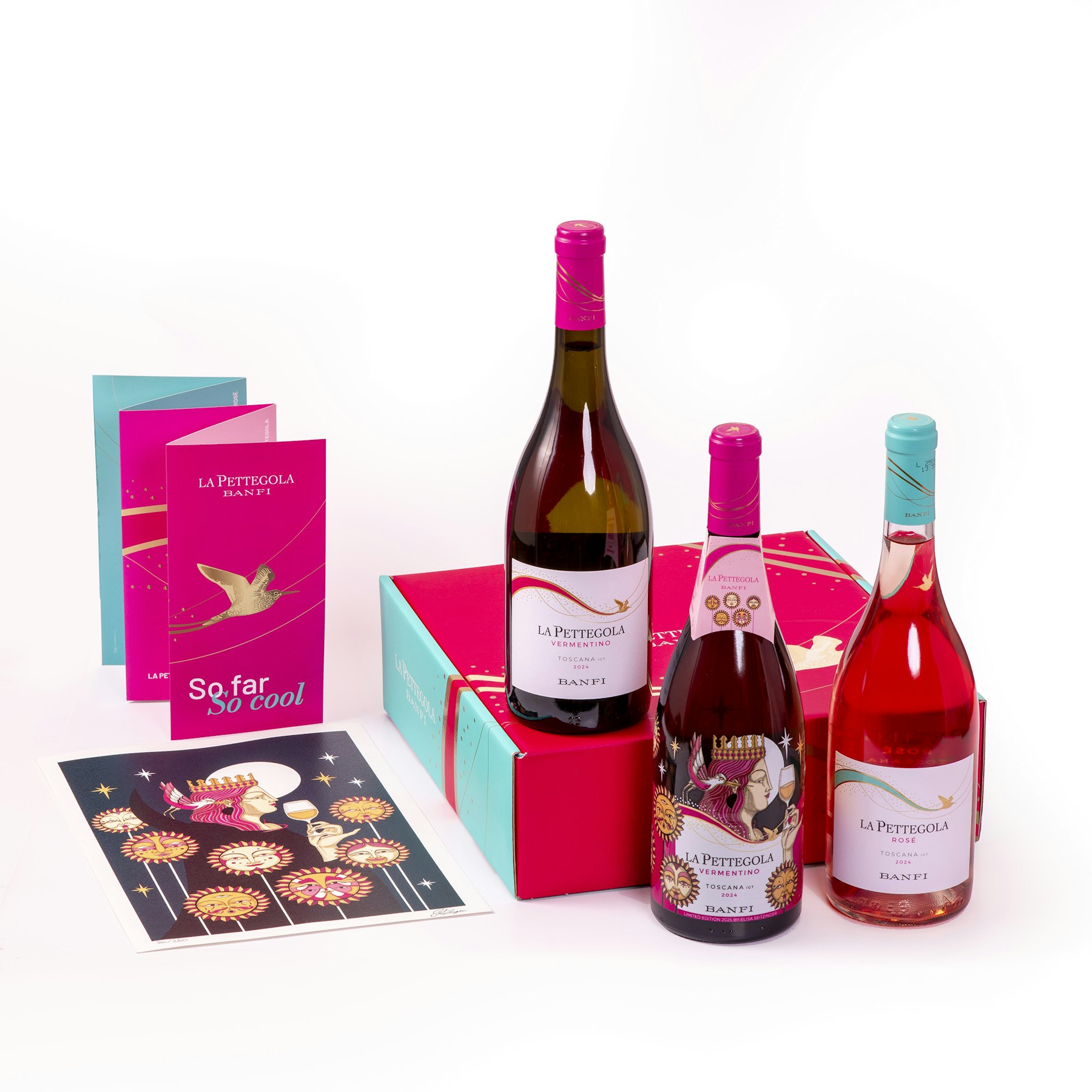 La confezione contiene: 1 bottiglia de La Pettegola 2024 Vermentino, 1 bottiglia de La Pettegola 2024 Rosé e 1 bottiglia de La Pettegola Limited Edition 2025 firmata quest’anno dall’artista Elisa Seitzinger. L’etichetta d’autore 2025 si anima con la realtà aumentata grazie all’app Banfi Experience.